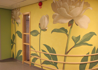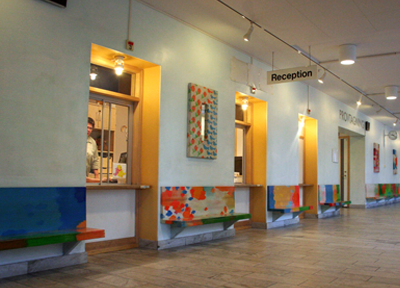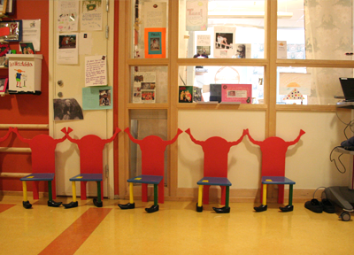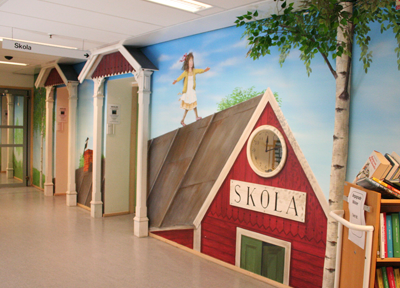 スウェーデンのストックホルムに位置するカロリンスカ大学病院。アストリッド・リンドグレーン子供病院は、緑にあふれたキャンパスの中にありました。この病院では2011年の当時、10人のホスピタルプレイスペシャリストが活動していました。病院を訪れると、病院の基金部門のコーディネーターであるサンナ・ミュレイ・サンダーさんが、病院中に施された子供のためのアート作品やインテリアを丁寧に見せてくださいました。それらの作品はスウェーデンの作家や地元の美大生によるもので、院内で過ごす子供の緊張をほぐすように、とてもよく考えられて作られており、見ていて温かい気持ちにさせてくれるものでした。後日、同病院のホスピタル・プレイスペシャリストであり、同分野の先駆者であるクリスティーナ・シルヴェリウスさんにもスウェーデンのプレイセラピーとプレイプリパレーションについて話をうかがうことができました。