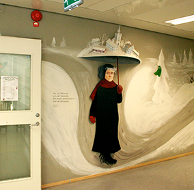 The Karolinska University Hospital is located in Stockholm. The Astrid Lindgren Children’s Hospital stands in a campus with full of trees. At the time of 2011, ten hospital play-specialists were working at this hospital. When I visited there, Ms. Sanna Murray Salander, a managing director of the foundation of the Astrid Lindgren Children’s Hospital kindly showed me the art works and interior designs placed throughout the hospital one by one. They were the works made by Swedish artists and the students of a local art university with deep consideration in order to ease children’s tension in the hospital. So, they made me warm-hearted. After the day, I made an interview to Ms. Kristina Silfvenius, a play-specialist at the hospital, one of the pioneers of play therapy and hospital play preparation.