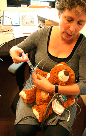 点滴の装着も、楽しげなパフォーマンスで説明する。子供にも同じく演じてみさせることが、前向きな気持ちを持たせるための鍵となる。