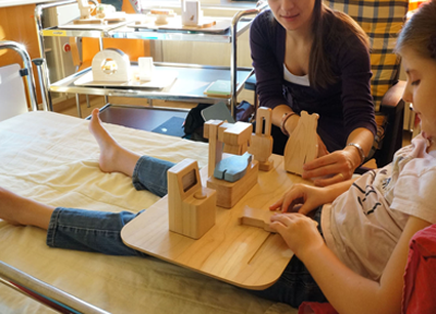 私が女の子の入院している部屋へ入ると、その女の子の隣に彼女の母親とソーシャルワーカーの女性が一緒に付き添っていました。私がおもちゃの説明をすると、女の子の母親は女の子がベッドに座ったままで遊べるように、おもちゃを彼女の膝の上にのせました。母親が付属の絵本を読んで、これはCT検査だと話始めると、彼女もすぐに理解したようで、彼女は人形をおもちゃ検査のベッドに寝かせたりして自分で遊びはじめました。すぐに、ベッドやマシーンを動かすと音や光が反応する仕掛けに気がつき、色々触って試し始めました。さらに、小さいクマを医者に見立て、「自分が医者になって検査をしている所なの」というように、どういう場面を演じているのか話し始めました。