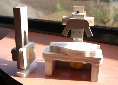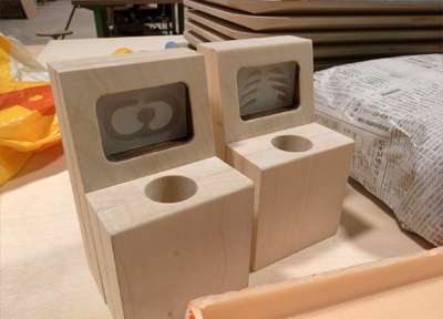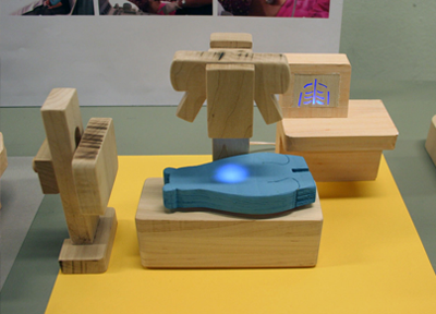 紙やフォーム材を使って、おもちゃのキャラクターや機器をデフォルメした形を作り、LEDライトや単純なモーター、小さなブザーなどを組み合わせて、それぞれの検査を特長づける表現を探りながら形を見つけていきました。また、子供がおもちゃで遊び始める前のイントロダクションとして使えるように、それぞれの検査機器をキャラクターに見立てた単純な話の絵本もつくる事にしました。(例えばX線では「私はX線といいます。あなたの身体の中の写真をとります」といったもの)